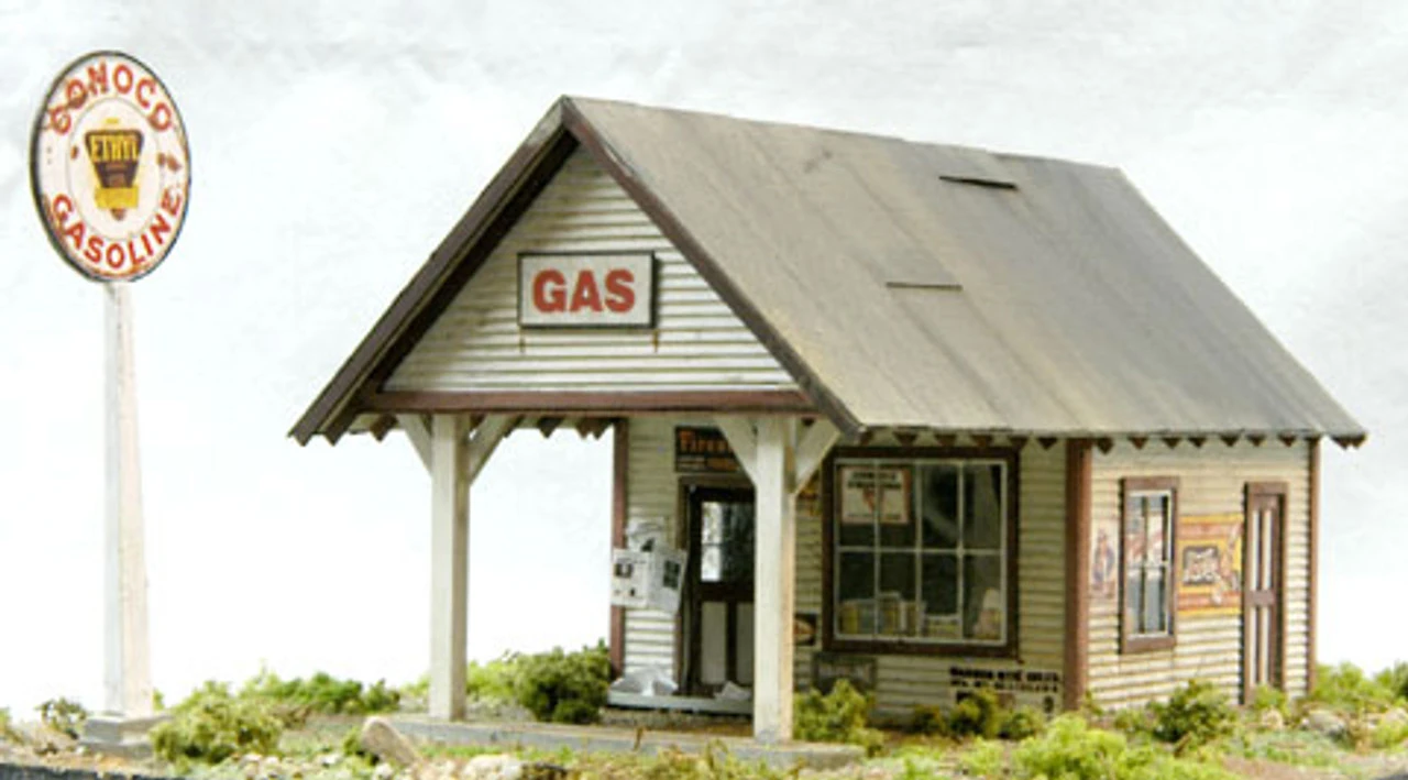 Laser cut wood, peel and stick windows for easly glazing, a great addtion to any model railroad!!!! Kit includes signs. Gas station pumps and details available from other sources. The foot print is a scale 18′ x 32′