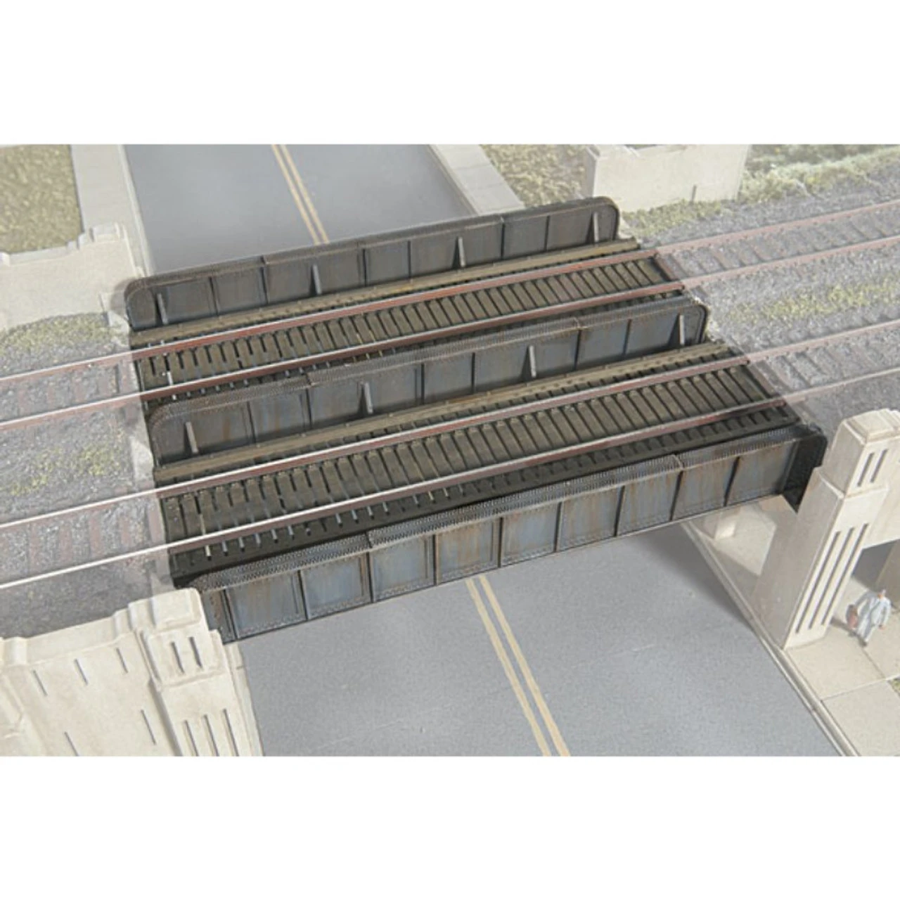 This Walthers Cornerstone Through Plate-Girder Bridge kit is based on one of the most common North American railroad bridge designs. It’s part of the Cornerstone Engineered Bridge System and is designed to be compatible with system abutments and bridge piers. Plate-girder bridges are typically used to cross short distances between 30 and 90′ 9.1 to 30.4m. Used for many decades, this design is constructed of several steel sections riveted together to form girders. They’re known as through types as the track passes between, rather than on top of the spans. It’s ideal for use with the Walthers Code 83 Bridge Track 948-886 or other trackage of your choice. The kit can be built either as a single- or a double-track bridge. Each includes parts for two complete spans, but the design makes it easy to combine additional kits (sold separately) to build a longer or wider bridge if needed. The plastic parts are molded in color and feature authentic rivets and other fine details. Part of the Cornerstone HO Scale Engineered Bridge System. One of the most common North American railroad bridge designs Fits steam, diesel and modern eras Used to cross short distances of about 30 to 100′ (9.1 to 30.4m) Includes parts to build as a single or double-track bridge Easily added to new or existing scenery Authentic rivets and other details Molded in dark gray plastic As shown the Through Plate-Girder Bridge is 6″ 15.2cm long and can be built several tracks wide by combining kits.
